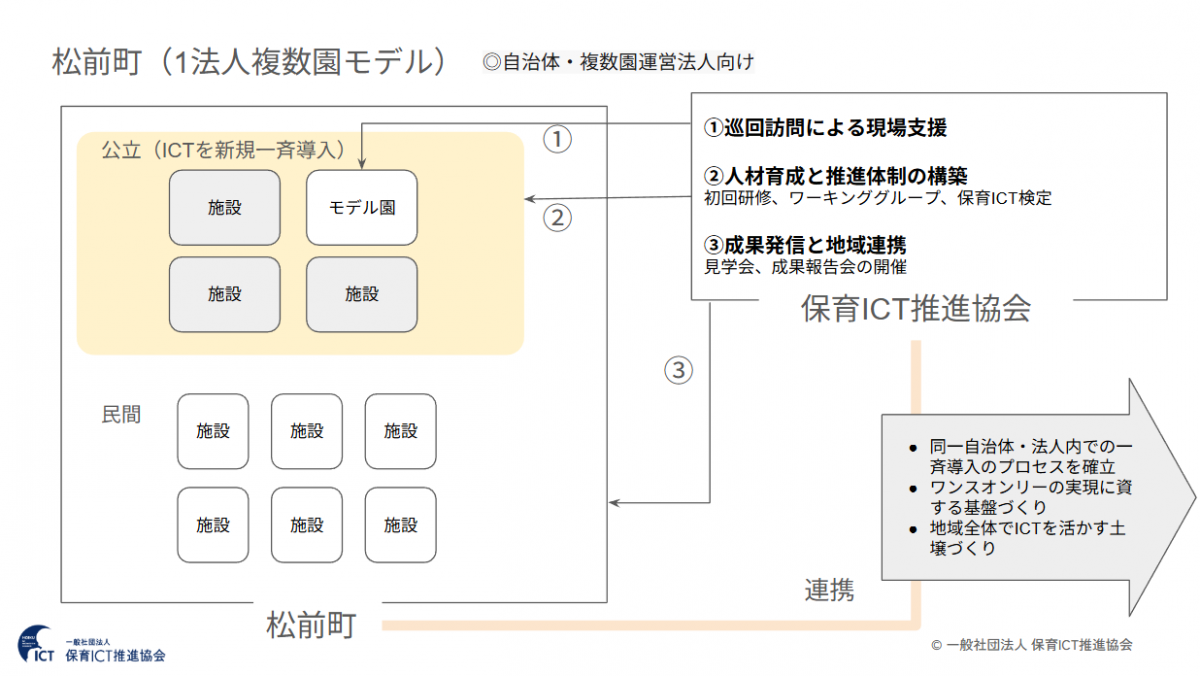 本事業の目的は、複数園での円滑なICT一斉導入と安定的な定着の実現です。導入に向けた合意形成や運用ルールの整備を支援し、導入初期から現場の理解と納得を得ることで、将来的には「ワンスオンリー」など行政手続の効率化に資するICT活用の体制構築を図ります。